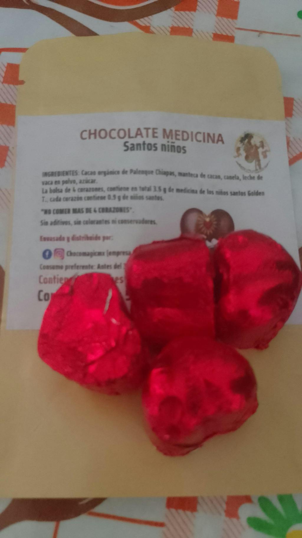 Cada corazón artesanal (13.3 g de chocolate) de venta individual contiene exactamente 1 gramo de Niños Santos albinos, garantizando una dosis precisa y respetuosa para tu viaje.